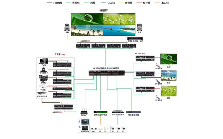 AN2000-R设备是目前最好画质的4K分布式系统,利用10GbE以太网技术实现视频、音频、以太网和其他控制信号进行矩阵切换、画面拼接功能。分辨率达4096*2160@60HZ 4 : 4 : 4,提供无与伦比的图像画质,无画面延迟、无压缩、无伪影。硬件搭配软件平台,具有可扩展性、多功能性,支持各种不同的应用,包括点对点扩展、矩阵无缝切换、视频墙显示。
