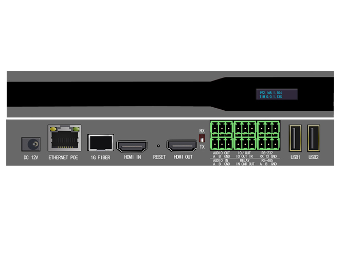 5)HDMI接*2(输入*1,输出*1),USB接口*2,RJ45*1,音频接口AUDIO*2,RS485*1,RS232*1,I/O*1,IR*1;
