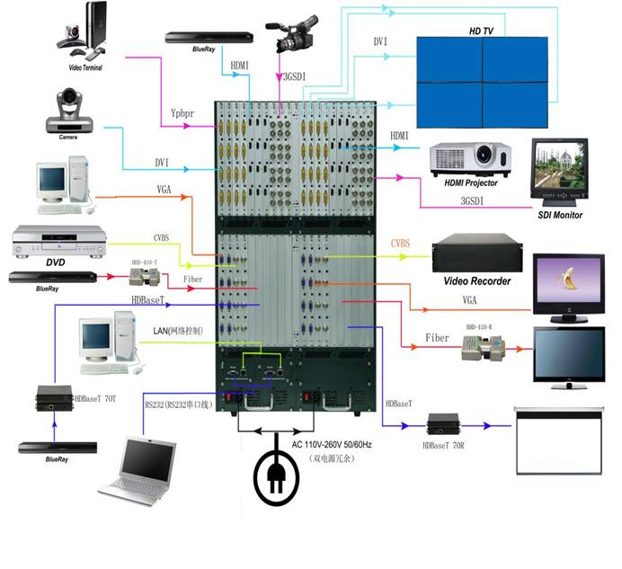 此系列矩阵是一款一卡四路的多功能混合管理器,采用模块化的设计理念,增加音频的解析,传输,分配,切换功能。采用“触摸式”管理的设计理念,前面板设10英寸真彩屏管理。此系列矩阵采用一卡四路的输入输出方式,可最大限度的增加输入输出路数,给用户带来更多的选择和最新的体验。单路可实现CVBS/YPbPr/VGA/HDMI/DVI五类信号的任意转换,切换,传输功能,配备信号分辨率软硬调节,指示软硬调节,信号类型选择软硬调节功能,支持4K、EDID、HDCP是自动适应调节和解析,支持无缝快速切换功能,无黑屏、蓝屏、闪屏、裂屏现象,强大的性价比,更加体现了它的价值。此系列矩阵采用了双控制系统设计,可以接入两套不同的控制系统,采用了双电源冗余设计,当其中一路电源出现故障,可以自动切换到另外一路备份电源。此系列矩阵采用了先进的电磁防护设计,可以有效的屏蔽掉来自周边环境的电磁干扰,从而使设备稳定的运行。 此系列矩阵单通道交换信号速率高达6.75Gbps,主板交换能力主板交换能力采用四核四链路处理技术,核心交换能力可达速率32Gbps。数字信号运用无压缩的传输方式,保证图像信号的高保真输出;独特的信号链路屏蔽设计技术保证信号的完整性;内部核心数字开关具有超强的抗干扰能力及长期连续工作的高稳定性;运用UC/OS-II操作系统,真正实现智能化控制,有力的保证设备的稳定运行;运用先进的高级算法,保证命令的