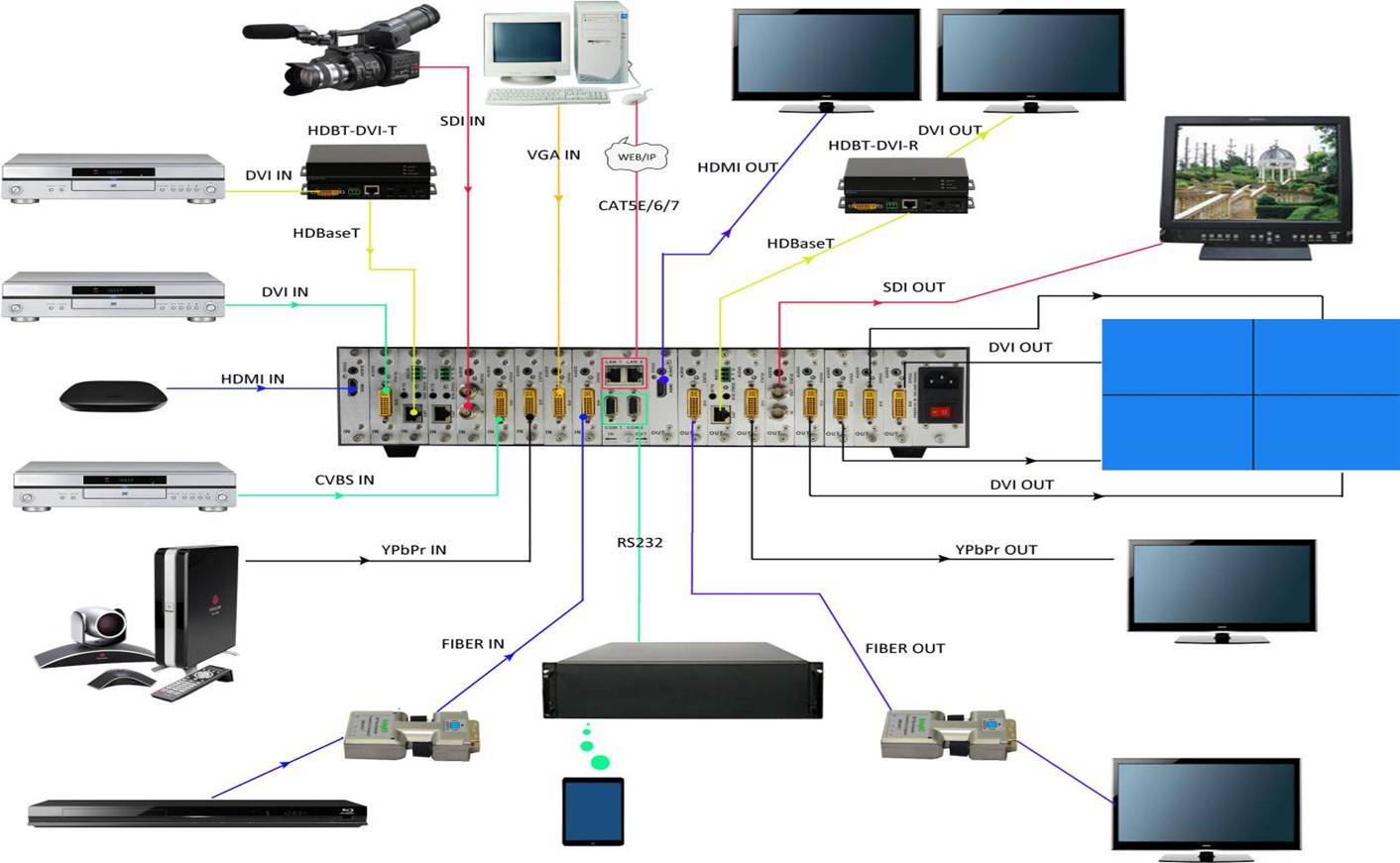 单接口板卡,支持HDMI、DVI、3GSDI、VGA、YPBPR、CVBS、网络、光纤输入 |